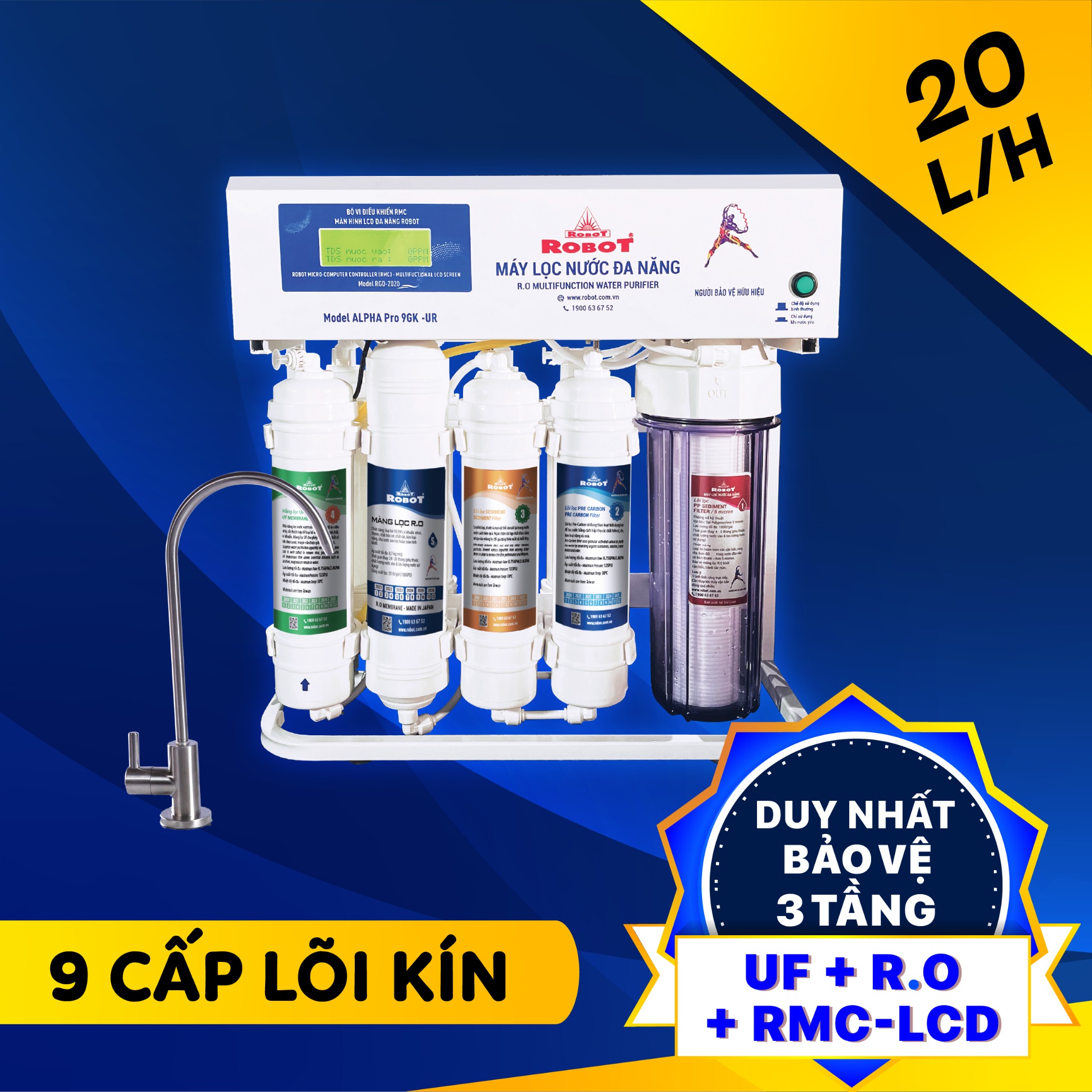 - Máy lọc nước ROBOT ALPHA PRO 9GK-UR thuộc dòng Máy lọc nước thế hệ mới của ROBOT, duy nhất trên thị trường sử dụng công nghệ “Bảo vệ 3 tầng” gồm 2 màng lọc UF + R.O & vi điều khiển RMC/LCD.
